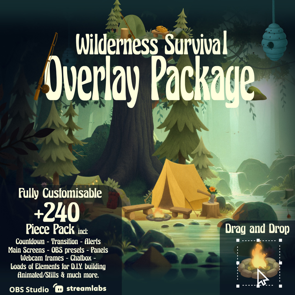Wilderness Survival Camp Twitch Overlay Stream Pack for Vtuber in OBS / Streamlabs With leads of Decoration Assets to build your own Layout
