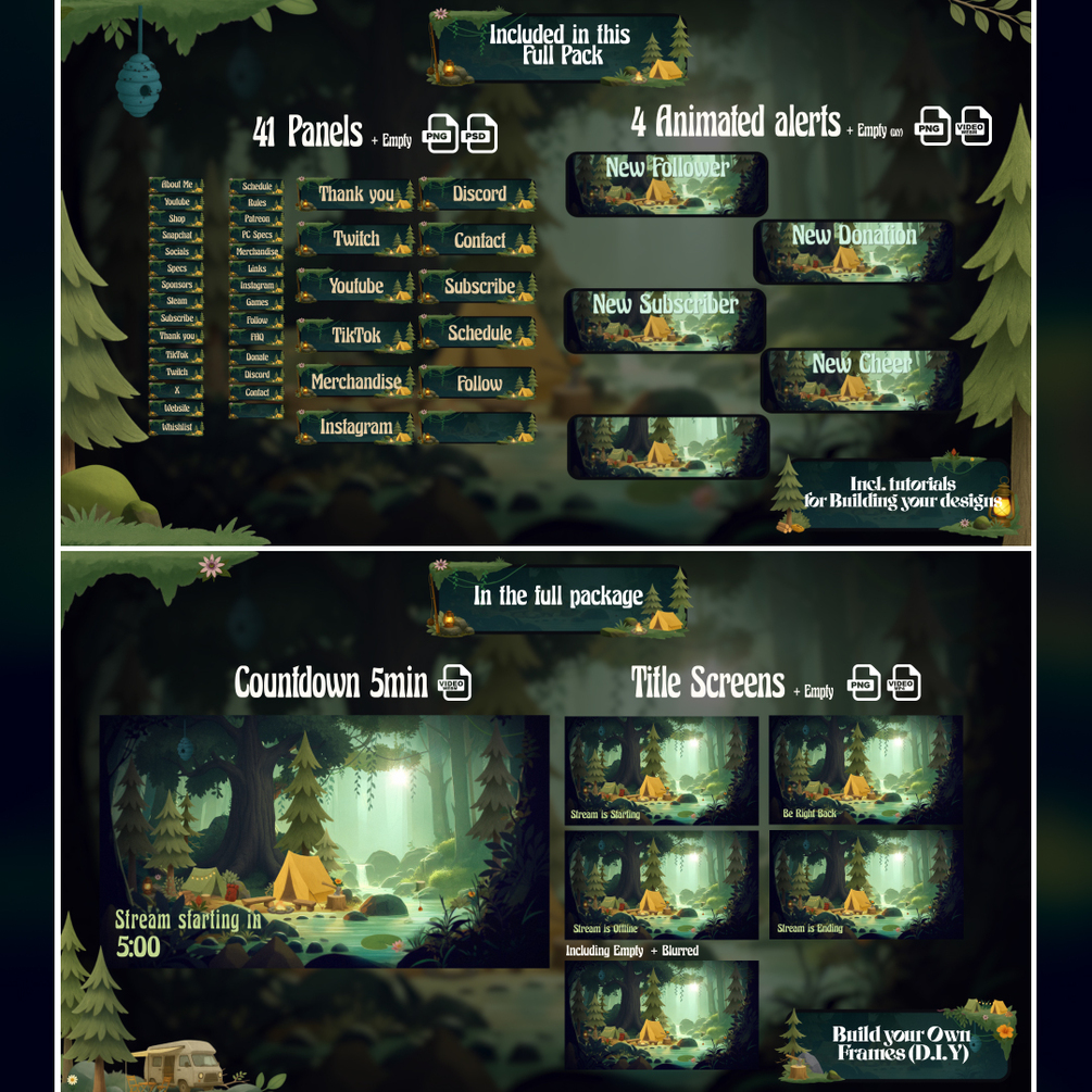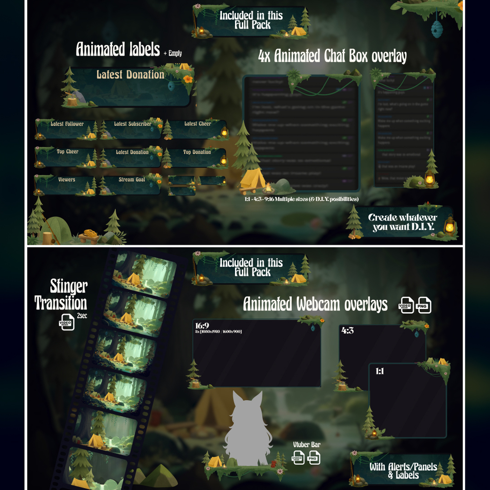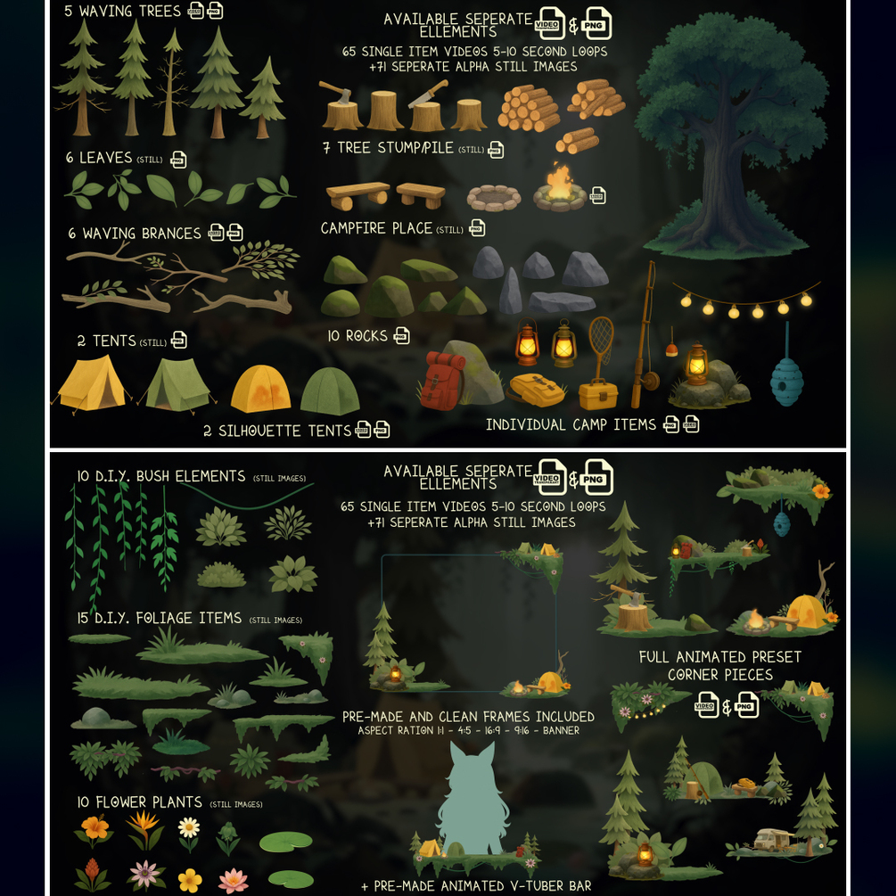This cozy streaming bundle includes over 240 items. From transitions, streaming screens, panels and labels to the DIY assets with 65 Animated assets, en 71 static images to build your stream to such as tents, campfires, pine trees, backpacks, fishing gear, lanterns, wooden signs, and foliage. All in a soft, illustrated style that brings peaceful nature vibes to your stream. Useable with OBS, Streamlabs, Stream elements, Tiktok live studio. And comes with Font (lettertype) and Tutorial link to my Youtube Tutorials page (in the downloadable PDF)